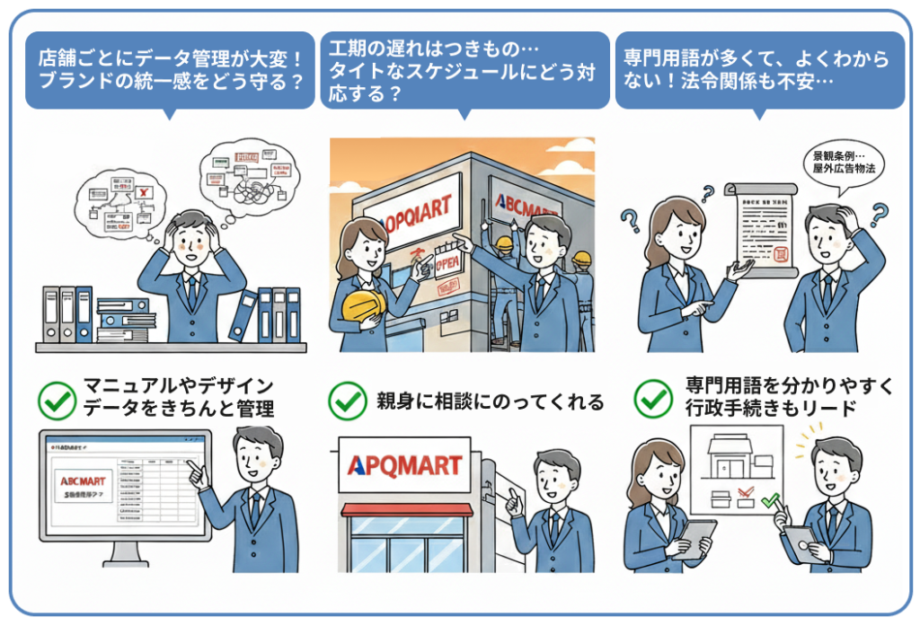 頼りになるのは、FC展開の実績が豊富で、マニュアルやデザインデータをきちんと管理してくれる看板業者です。