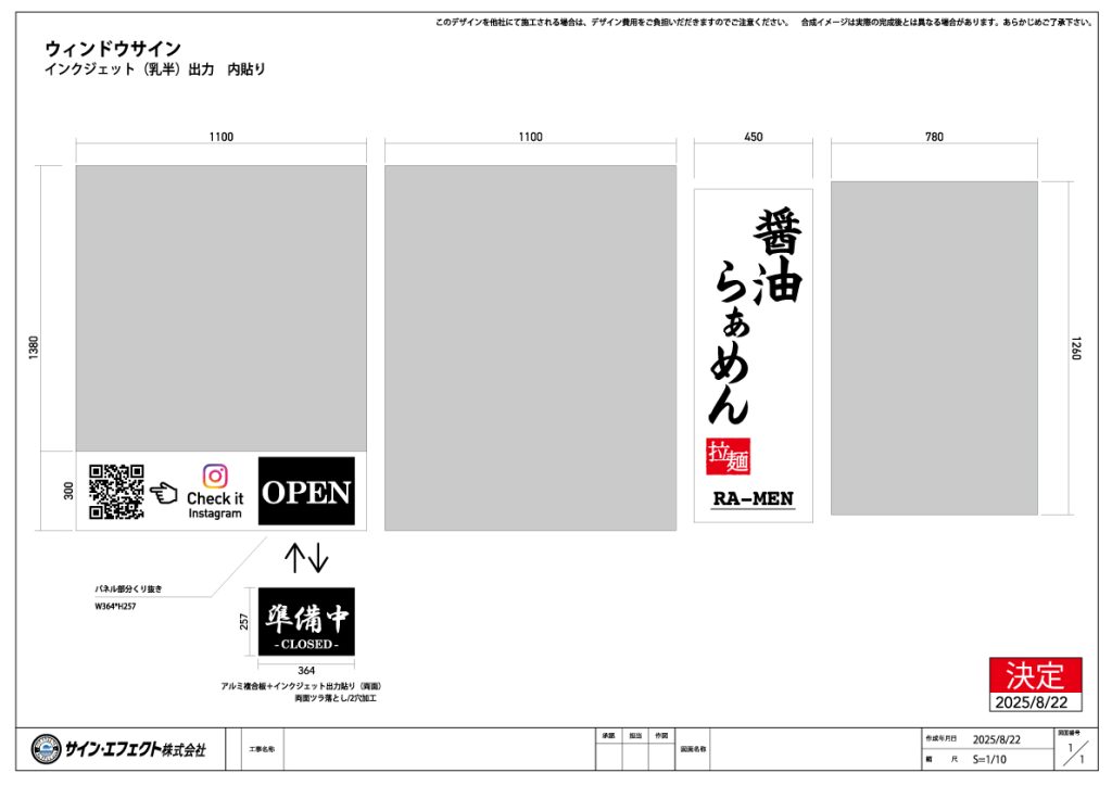店内へ差し込む光はさえぎらないように窓面(2F)にサインを設置したい。
